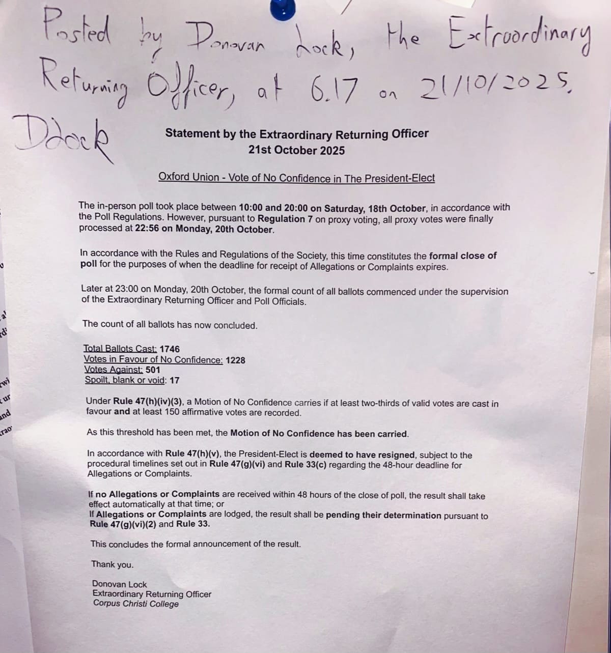 On 22 October, results showed 70% of 1,746 valid ballots supported no confidence, surpassing the two-thirds majority required under Union rules. Abaraonye was deemed to have resigned, though he contested the outcome, alleging flawed procedures and unauthorised access to proxy votes. He has lodged a formal complaint, insisting he remains President-elect pending a disciplinary appeal.