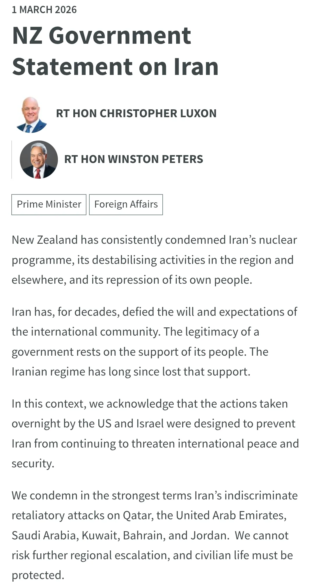 The NZ government statement follows: